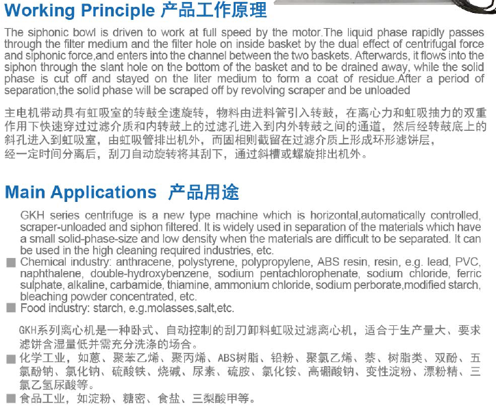 主電機(jī)帶動具有虹吸室的轉(zhuǎn)鼓全速旋轉(zhuǎn),物料有進(jìn)料管引入轉(zhuǎn)鼓,在離心力和虹吸抽力的雙重作用下快速穿過過濾介質(zhì)和內(nèi)轉(zhuǎn)鼓上的慮孔進(jìn)入到內(nèi)外轉(zhuǎn)鼓之間的通道,然后經(jīng)轉(zhuǎn)鼓底上的斜孔進(jìn)入到虹吸室,由虹吸管排除機(jī)外,而固相則截留在過濾介質(zhì)上形成環(huán)形濾餅層,經(jīng)一段時間分離后,刮刀自動旋轉(zhuǎn)將其刮下,通過斜槽或螺旋排出機(jī)外。