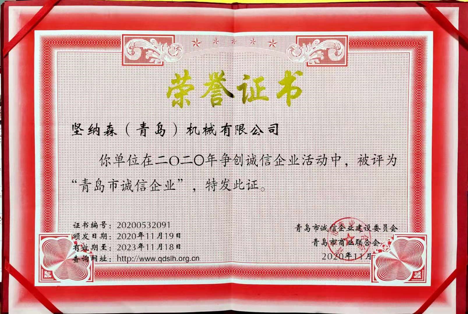 祝賀堅納森(青島)機械有限公司榮獲“誠信企業”